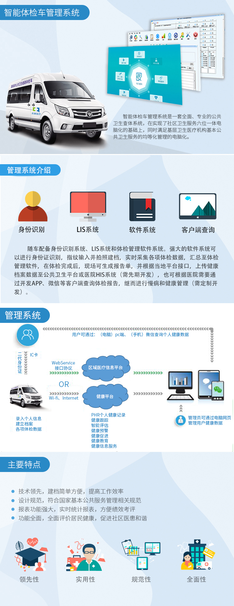 搭載車載體檢工作站,通過刷身份證或人臉識別方式快速創(chuàng)建健康檔案和信息登記,可進行常規(guī)檢查、生化檢測、輔助檢查等多項健康檢測,自動采